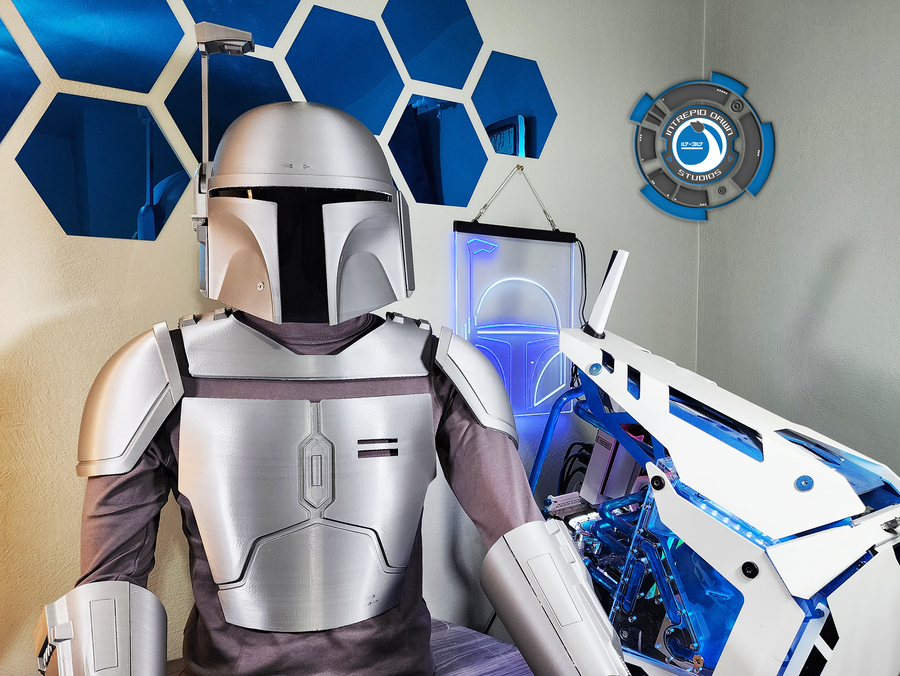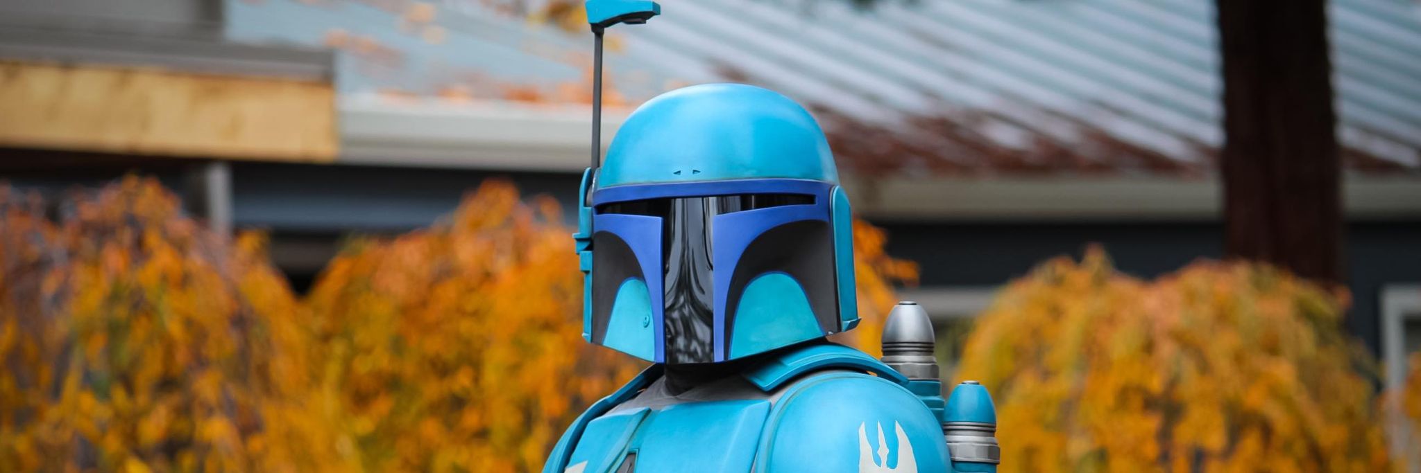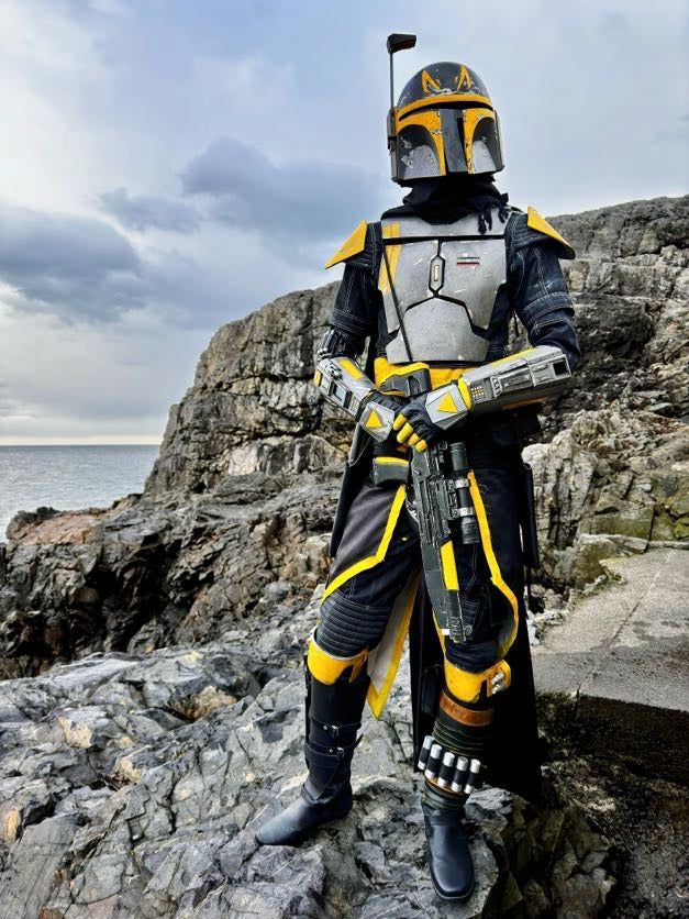 Matt F displays his custom mando armor featuring heavy wear and tear. Weathering pieces gives the armor character. Custom colors and paint schemes personalize the armor and tells the story of the mando.